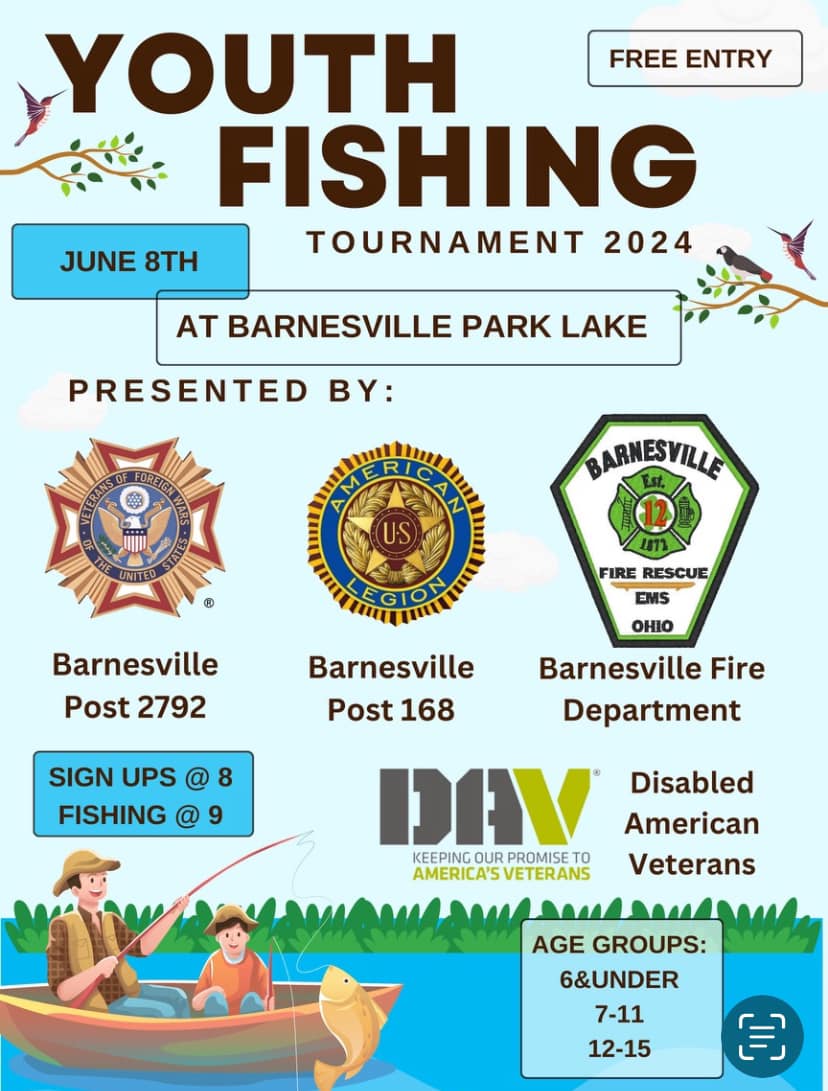 Youth Fishing Tournament 2024 + Add to Google Calendar + iCal / Outlook export Date Jun 08 2024 Expired! Time 8:00 am - 12:00 pm Location Barnesville Memorial Park 130 Fair Street, Barnesville, OH 43713 Category Community Organizer Barnesville Fire & EMS Department Phone 740-425-3054 Share this event Meeting Minutes & AgendasVillage NewsletterCodified Ordinances/LegislationMayorMayor’s CourtVillage CouncilVillage Committees & BoardsCouncil Meeting ScheduleBid AdvertisementsEmployment OpportunitiesState, Federal & Local Resources News & Announcements Archives Archives Select Month January 2026 December 2025 November 2025 October 2025 September 2025 August 2025 July 2025 June 2025 May 2025 April 2025 March 2025 February 2025 January 2025 December 2024 November 2024 October 2024 September 2024 August 2024 July 2024 June 2024 May 2024 April 2024 March 2024 February 2024 January 2024 December 2023 November 2023 October 2023 September 2023 August 2023 July 2023 June 2023 May 2023 April 2023 March 2023 February 2023 January 2023 December 2022 September 2022