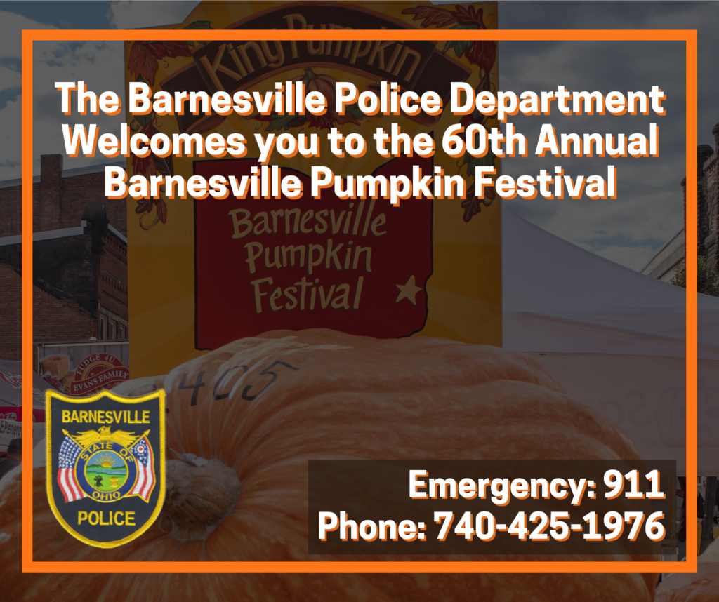 The Barnesville Police Department welcomes you to the 60th Annual Barnesville Pumpkin Festival. The festival begins this week ๐๐๐ฉ๐ญ๐๐ฆ๐๐๐ซ ๐๐-๐๐, ๐๐๐๐. As we prepare for this wonderful celebration, here are some important reminders for residents and visitors: