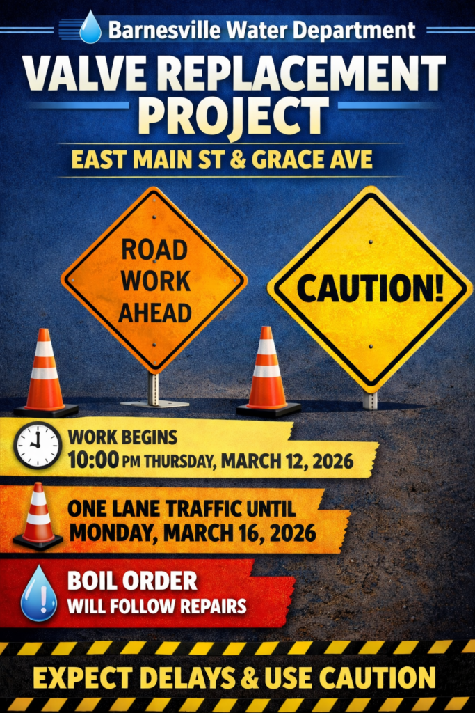 The Barnesville Water Department is planning a valve replacement project on East Main Street at the intersection of Grace Avenue. Work will begin at 10:00 PM on Thursday, March 12th, 2026 and continue into Friday morning. Temporary traffic lights will be set up on East Main Street from Thursday until Monday, March 16th, 2026 allowing for the repair as well as the concrete patch to cure. Grace Avenue residents may use the parking lot at Wilson Funeral Home to access their homes.